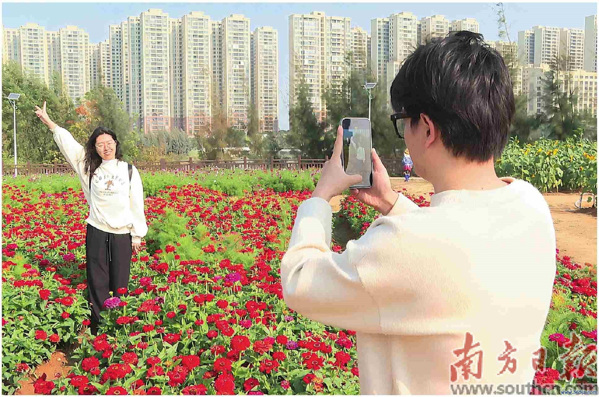在南湖公园花海区域,一派片向日葵曙光而立,金黄珍藏;格桑花摇曳生姿,多彩标记;万寿菊蜂涌成团,金黄一派;百日菊精雅怒放,超世绝伦。旅客们一边散步花海,一边拍照迷恋,沉溺于冬日的缤纷好意思景中。