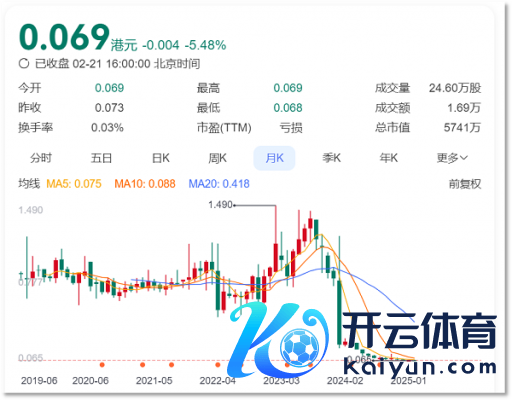 死心2025年2月21日,上涨旅游的股价仍是低至0.069港元/股,市值不及6000万港元,日成交额仅为1.69万港元。从走势上来看,自2023年9月底于今,上涨旅游股价捏续走低。其时变成上涨旅游股价下落的原因,其中之一即是2023年8月下旬,上涨旅游表露浙江飞加达前6个月均未完班师绩对赌的公告所致。