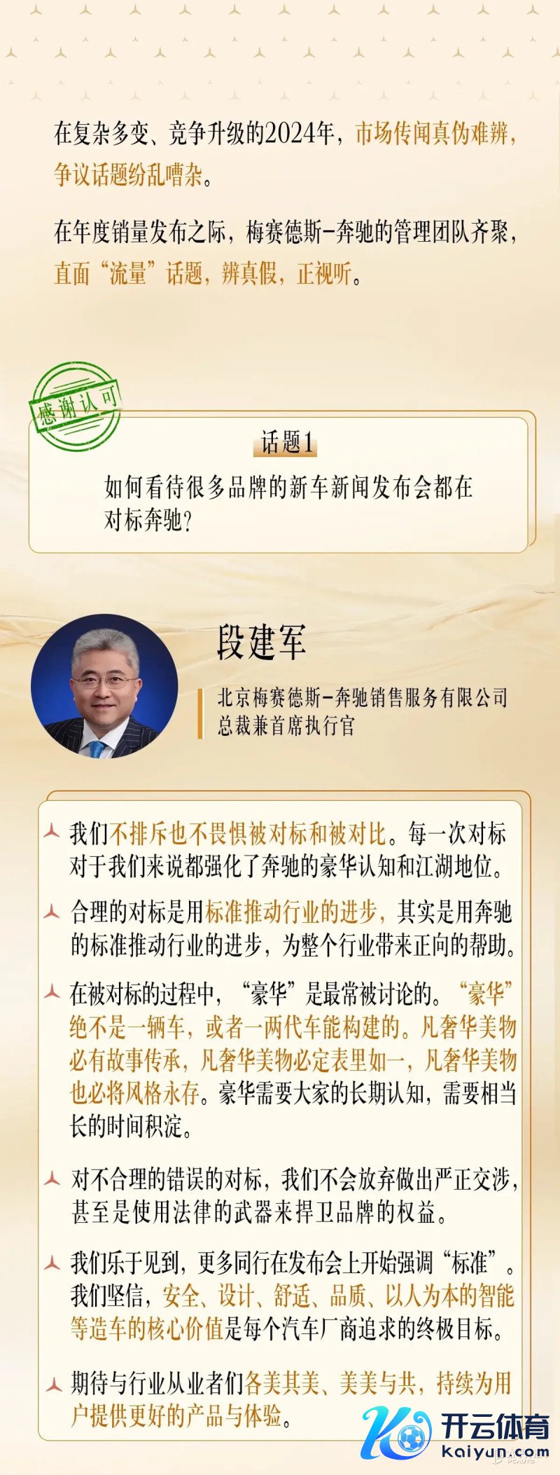 北京梅赛德斯-奔突销售办事有限公司总裁兼首席扩充官 段建军暗示,咱们不摈斥也不懦弱被对标和被对比,每一次对标关于咱们来说齐强化了奔突的豪华说明和江湖地位。