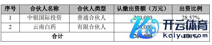 其中,云南白药行为有限结伙东谈主拟以自有资金认缴出资东谈主民币50亿元,占结伙企业认缴出资总和的71.43%;中银海外投资行为无为结伙东谈主拟以自有资金认缴出资东谈主民币20亿元,占结伙企业认缴出资总和的28.57%。