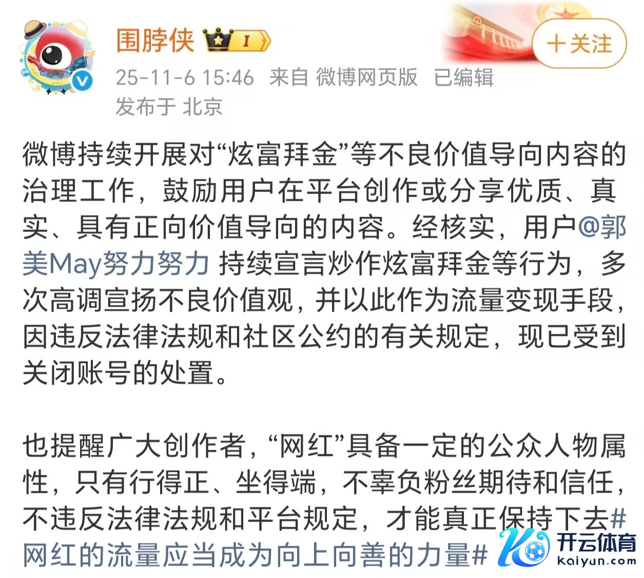 11月6日,微博官方账号围脖侠发文称,用户“郭好意思May起劲起劲”抓续炒作炫富拜金等行为,屡次高调宣扬不良价值不雅,并以此手脚流量变现妙技,因违抗法律纪律和社区契约的关联章程,现已受到关闭账号的治理。