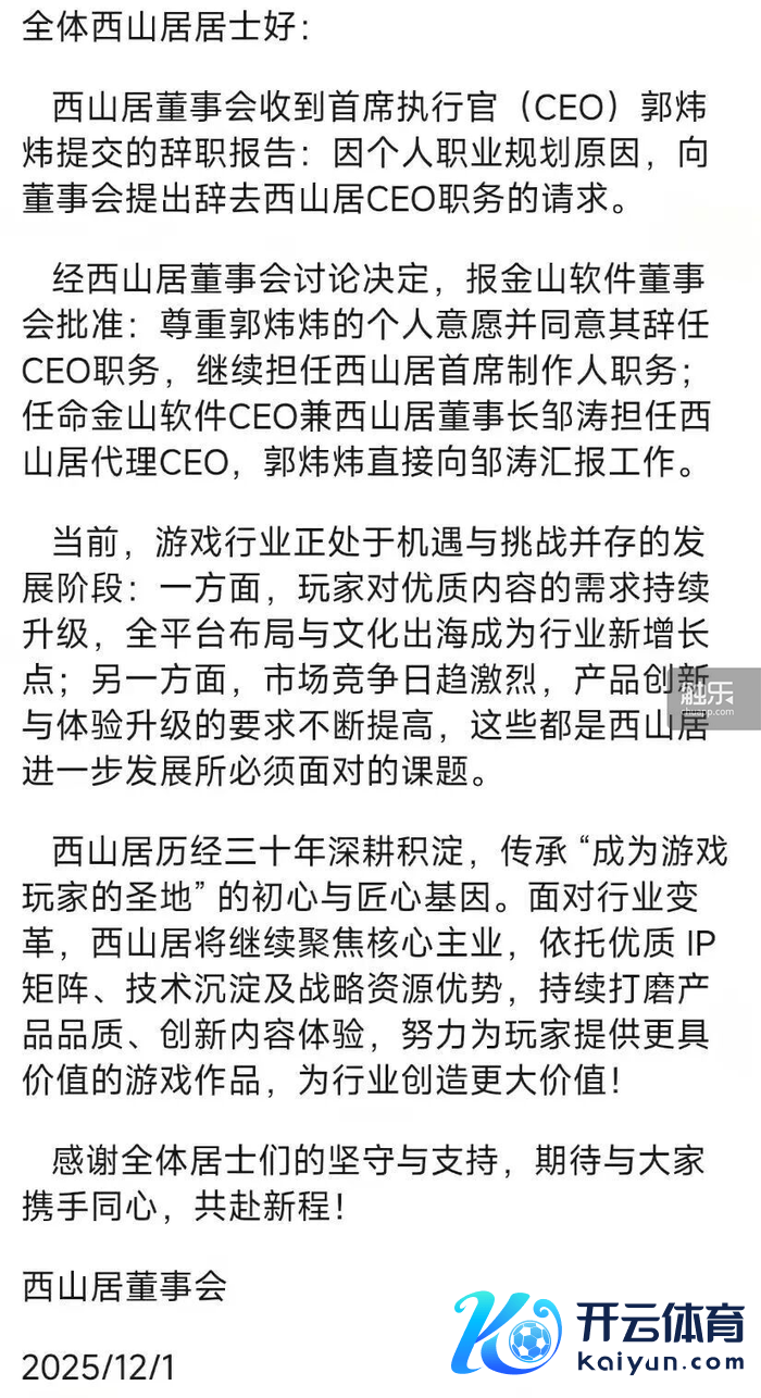 12月1日,西山居发布董事会公告称,郭炜炜因个东说念主做事狡计辞去CEO职务,央求已获批准。卸任后,他不再负责公司举座磋磨科罚,仅担任首席制作主说念主,专注于居品和内容创作。金山软件CEO兼西山居董事长邹涛将兼任西山居代理CEO,接办公司沿路过营职责。