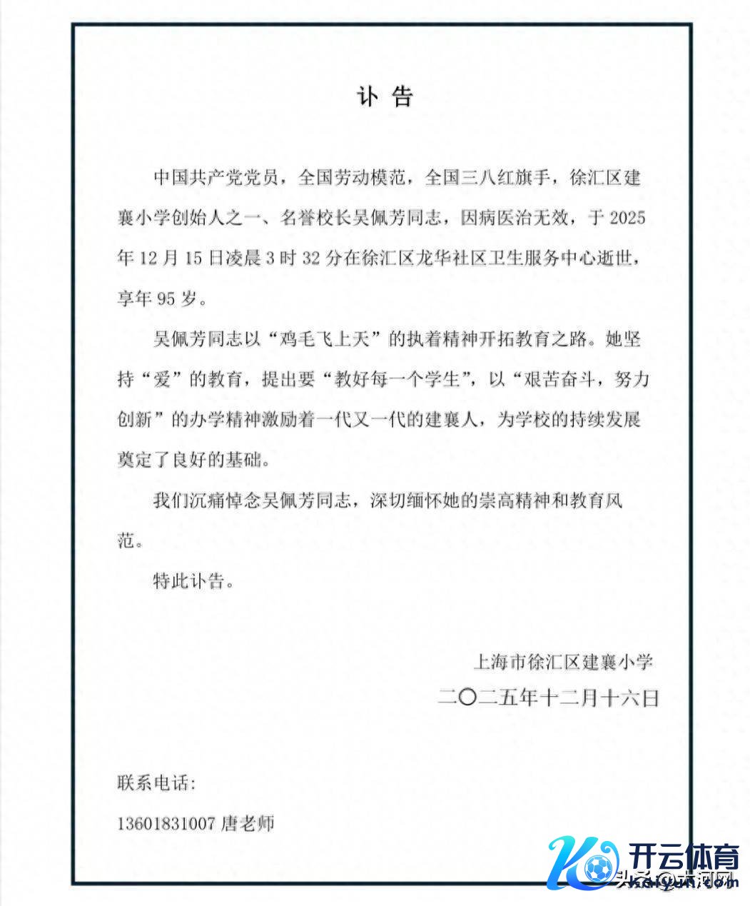 12月16日,“徐汇区建襄小学”微信公众号发布讣告:中国共产党党员,天下奇迹圭臬,天下三八红旗头,上海徐汇区建襄小学独创东说念主之一、名誉校长吴佩芳同道,因病医治无效,于2025年12月15日凌晨3时32分在徐汇区龙华社区卫生服务中心骤一火,享年95岁。