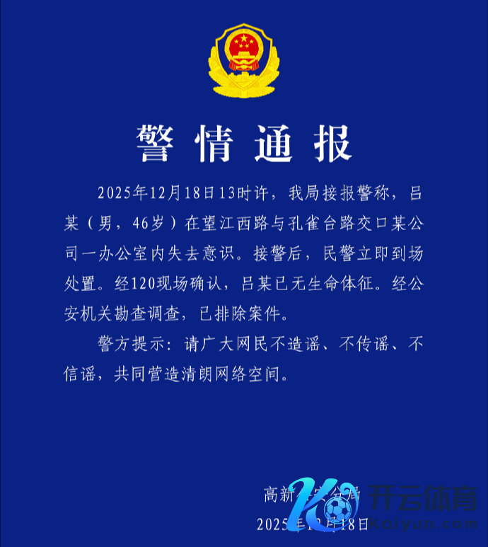 此前,合肥市公安局高新工夫栽种鉴识局发布警情通报:2025年12月18日13时许,该局接报警称,吕某(男,46岁)在望江西路与孔雀台路交口某公司一办公室内失去意志。接警后,民警立即到场贬责。经120现场阐述,吕某已无人命体征。经公安机关勘检察望,已排斥案件。
