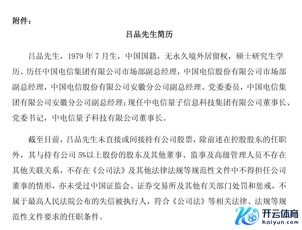 适度公告败露,吕品不抓有公司股票,亦不存在应当实验而未实验的股份锁定应承。吕品的灭尽不会导致公司董事会成员东说念主数低于法定东说念主数,不会影响公司董事会的当年运作。公司见解料理团队当年履职,公司将把柄相关法律律例和 《公司规章》 的规章,尽快完成董事补选及董事长选举的相关责任,并实时实验信息败露义务。